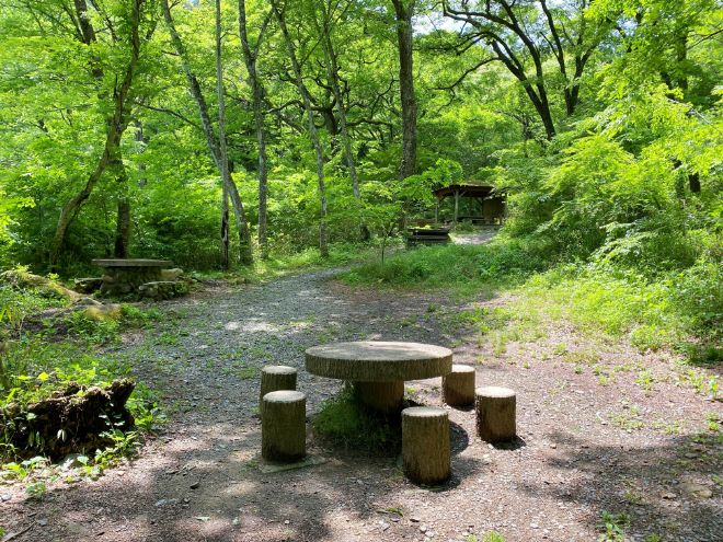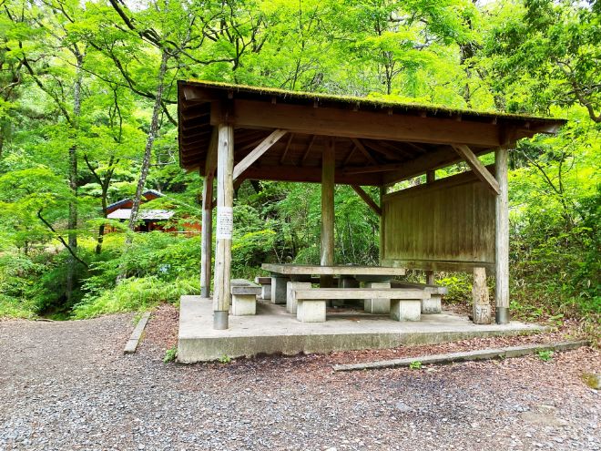 キャンプ場内には屋根付きの東屋も設置されています。急な雨が降ってきた時の避難場所として使ったり、食事する時のテーブルとして使用しても良いですね。