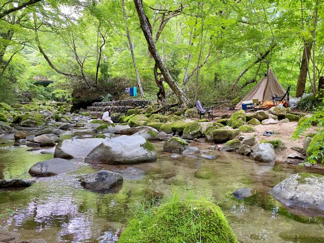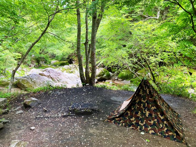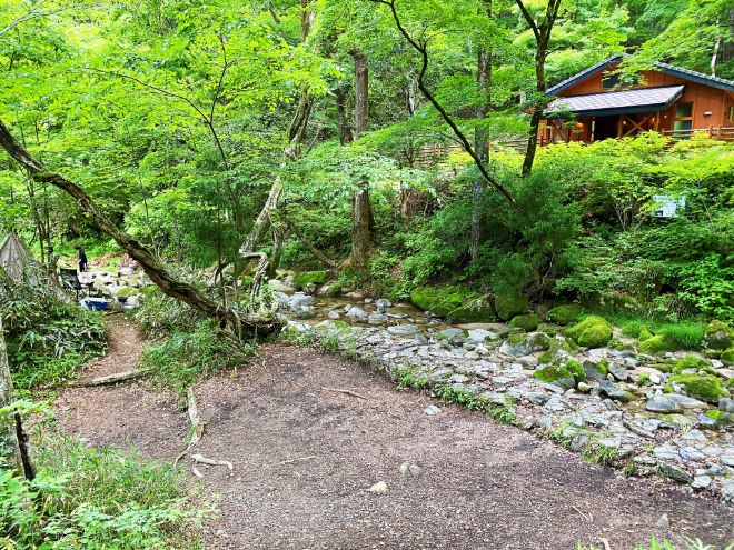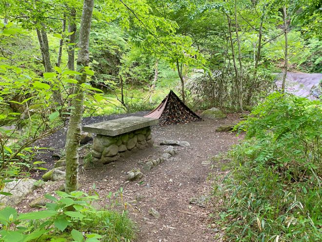 渓流沿いのサイトと広場のようになっているサイトで地面の特徴は異なりますが、どちらも石が埋まっている箇所が多くみられるので、なるべく頑丈な鍛造ペグなどを用意しておくことをおすすめします。また全体的になだらかに傾斜していますので、寝る時の頭の位置を考えながら設営した方が良いでしょう。