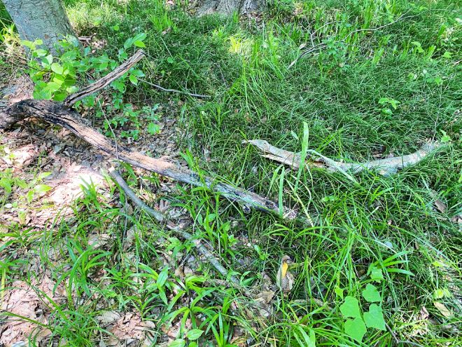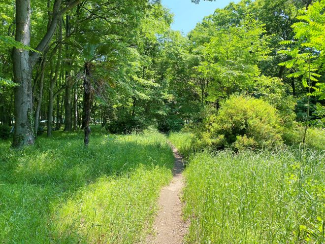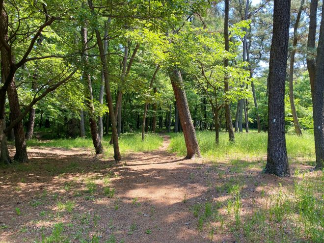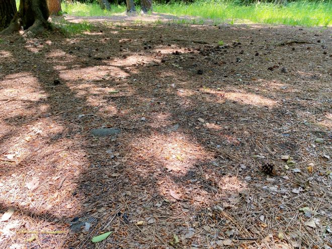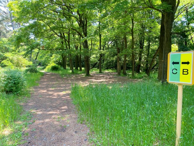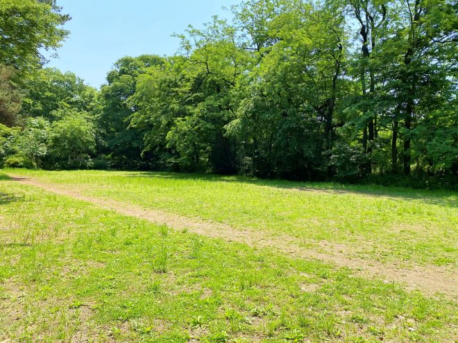 Cサイトから奥は林間の雰囲気がたまらないサイトが広がっています。こちらも区分けはされていませんが、木々の中に雑草が生えていないエリアがぽつぽつと有ったりして、ぐるっと見て回るとテントサイトとして使われていそうなスペースがいくつも見つかります。