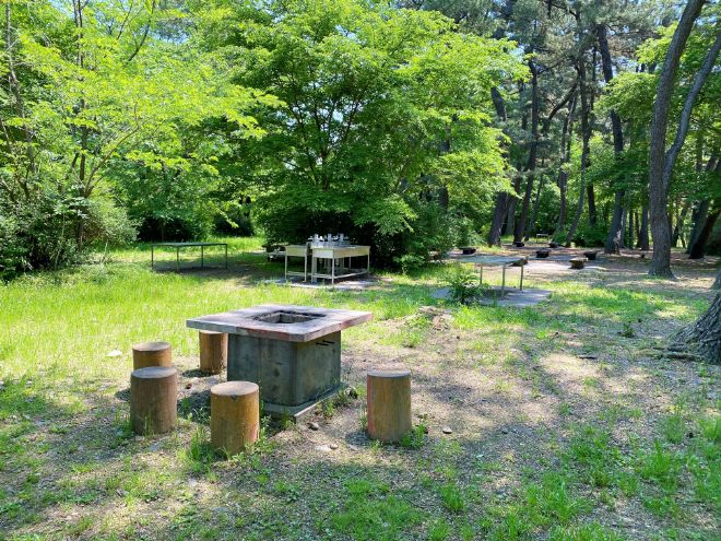 角渕キャンプ場内には、午前9時から午後4時(午後5時完全撤収)まで利用可能な角渕バーベキュー場もあります。こちらにはバーベキュー用のカマド兼テーブルが設置されており、炭と網を用意すれば気軽にバーベキューが楽しめます。