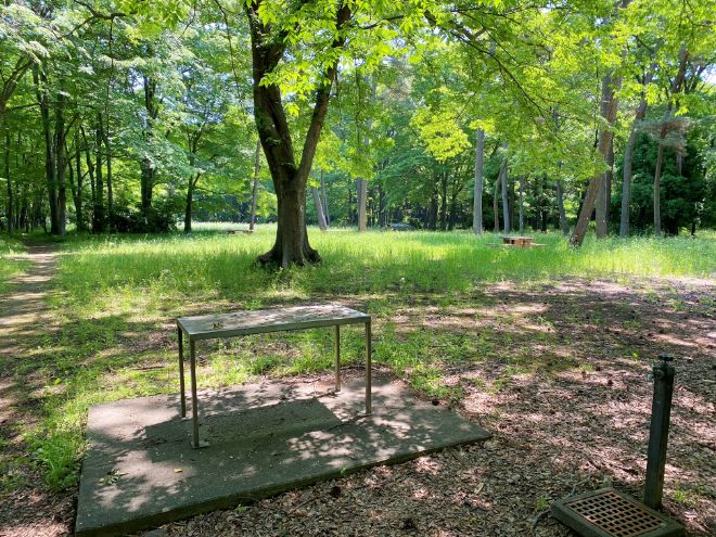 森の中にありながら、人の手が入っているであろう雰囲気が残されているので、いつもよりも少しワイルドな環境でキャンプを楽しみたいと思っている人にはおすすめです。エリア内に水場やテーブルなども用意されているので、利便性という面でも不自由はしないでしょう。