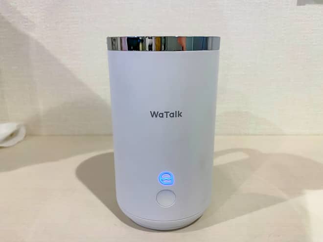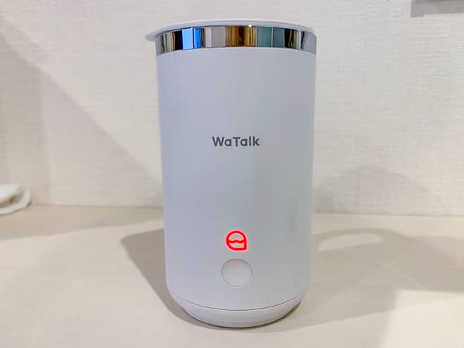 WaTalkの本体についているスイッチを押して電源をオン。ロゴマークが光って電源が入ったことを確認したら、もう一度スイッチを押すと、およそ15秒程度で結果が出ます。