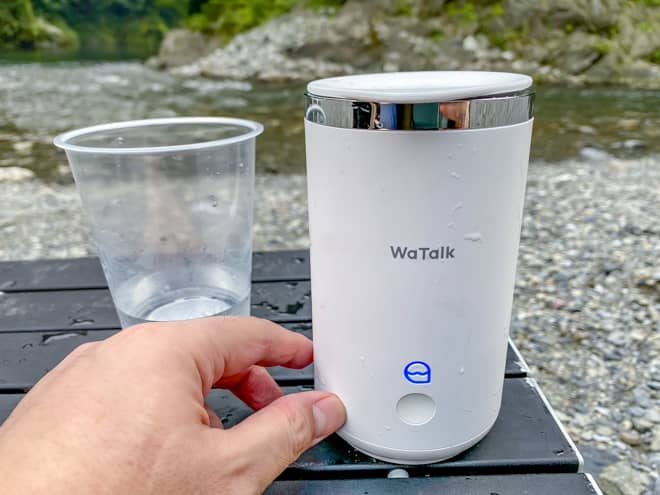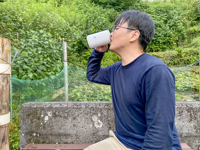 世界最高レベルのソーヤーミニで浄水したし、WaTalkでも青色ランプで水の綺麗さは保証されました。もう喉もカラカラなので、自己責任でグイっと飲んでみましょう。