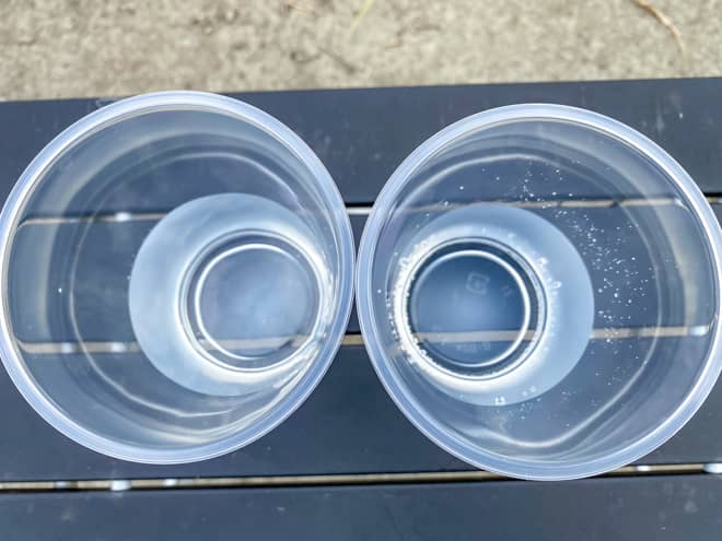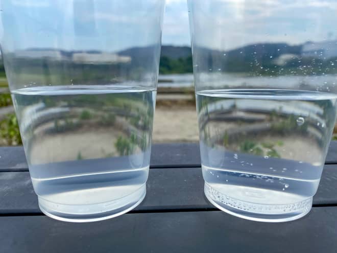 ソーヤーミニで浄水してみましたが、目で見た限りでは浄水前と後に差はありません。どっちも透き通っていて美味しそうなんだけどなー。