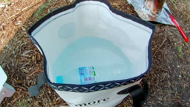 凍らせたペットボトルが溶けた後は飲み水として使用する事で帰りは軽くなりますし、バケツ本体も折りたたみなので軽量コンパクト!嵩張らないのでザックにらくらく収納可能です。夏の徒歩キャンプにはぴったりのギアだと思います。