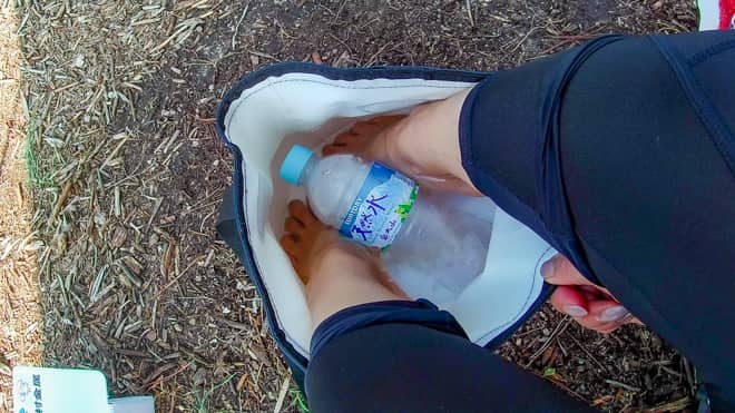 設営で汗だくになった後、冷たい水に足を浸すと想像以上に涼しくて気持ち良い!凍らせたペットボトルを入れて氷水にすると更に気持ち良い!設営で汗をかいた後、冷たい飲み物を飲みながら冷たい水に足を浸してのんびりする時間は最高です。
