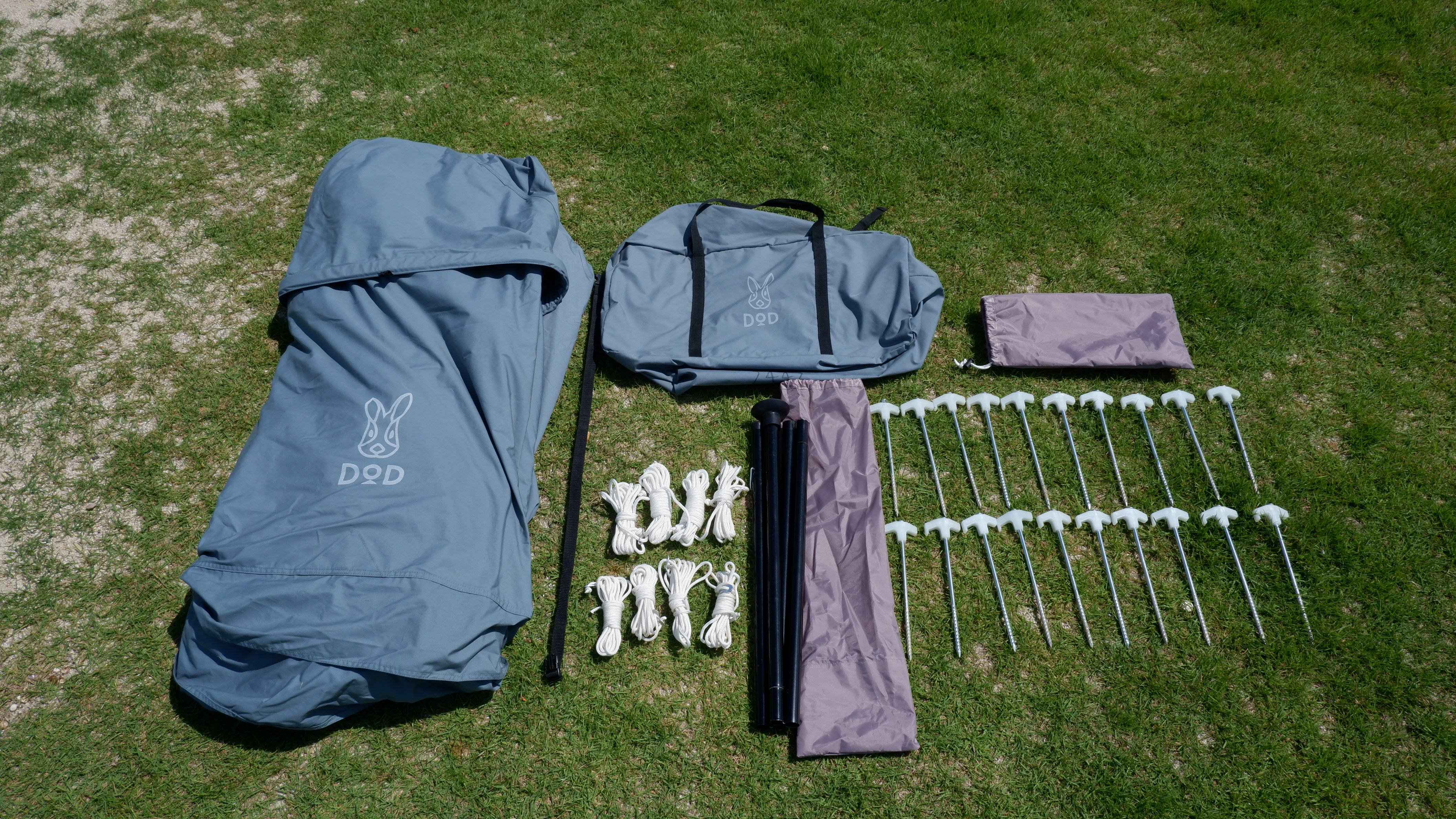 付属品はフライシート、ポール、ロープ(短)×4 、ロープ(長)×4、ペグ×20、ポール用収納袋、ペグ用収納袋、キャリーバッグ、タイベルト