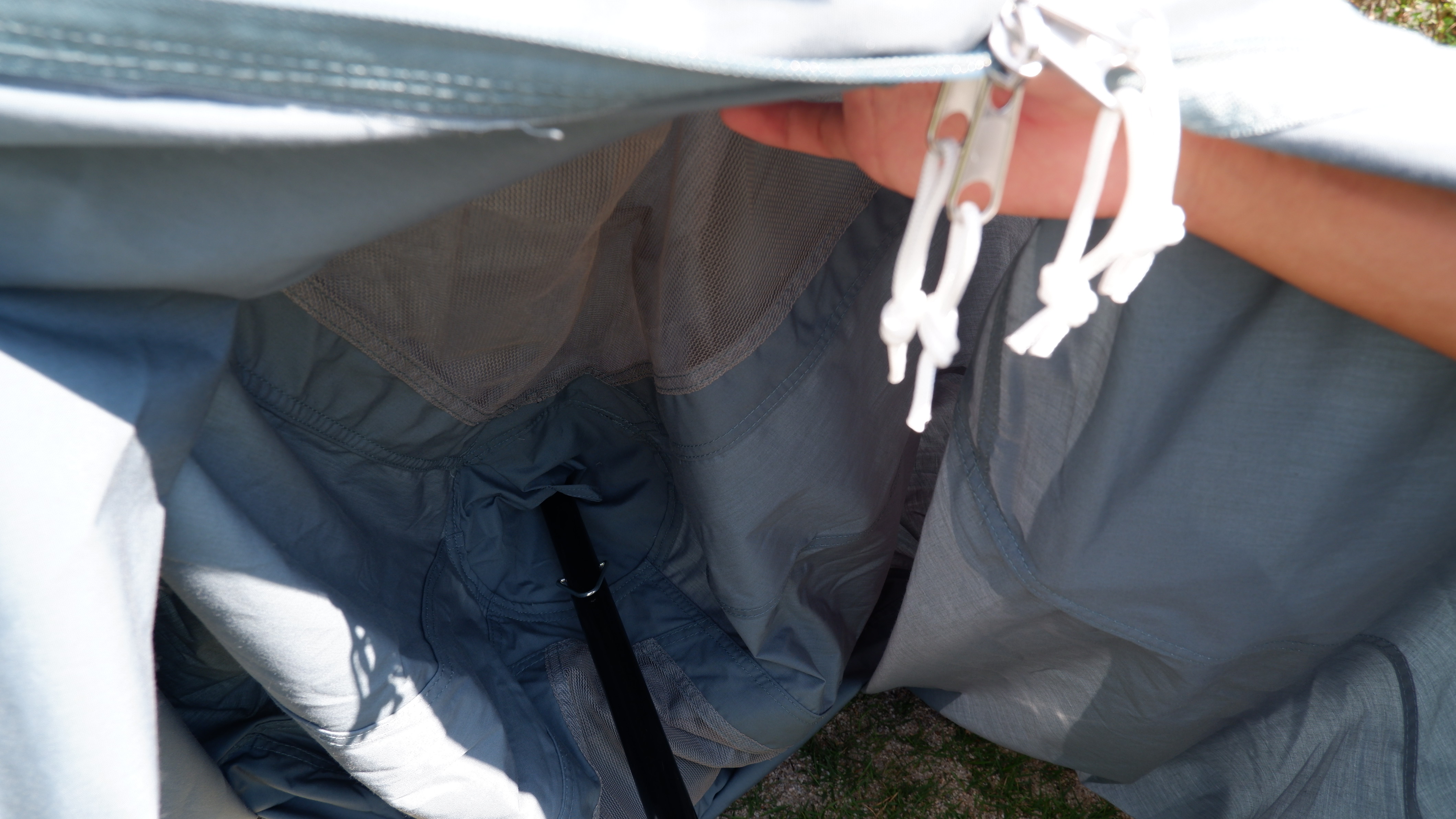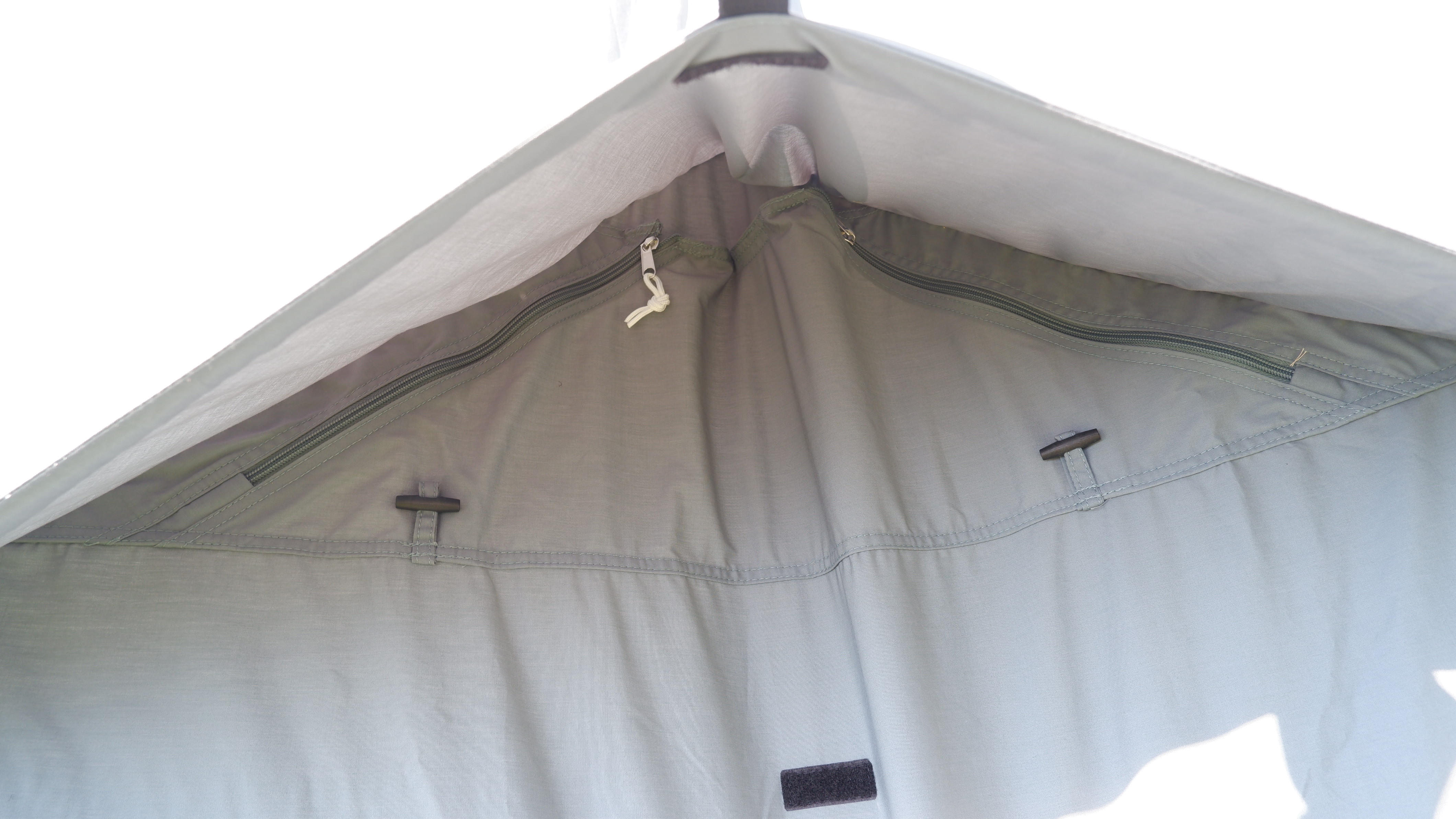 前後についている板をベンチレーターの裏側についているマジックテープとくっつけ、左右のベンチレーターは外側のロープを張れば換気が可能になる。