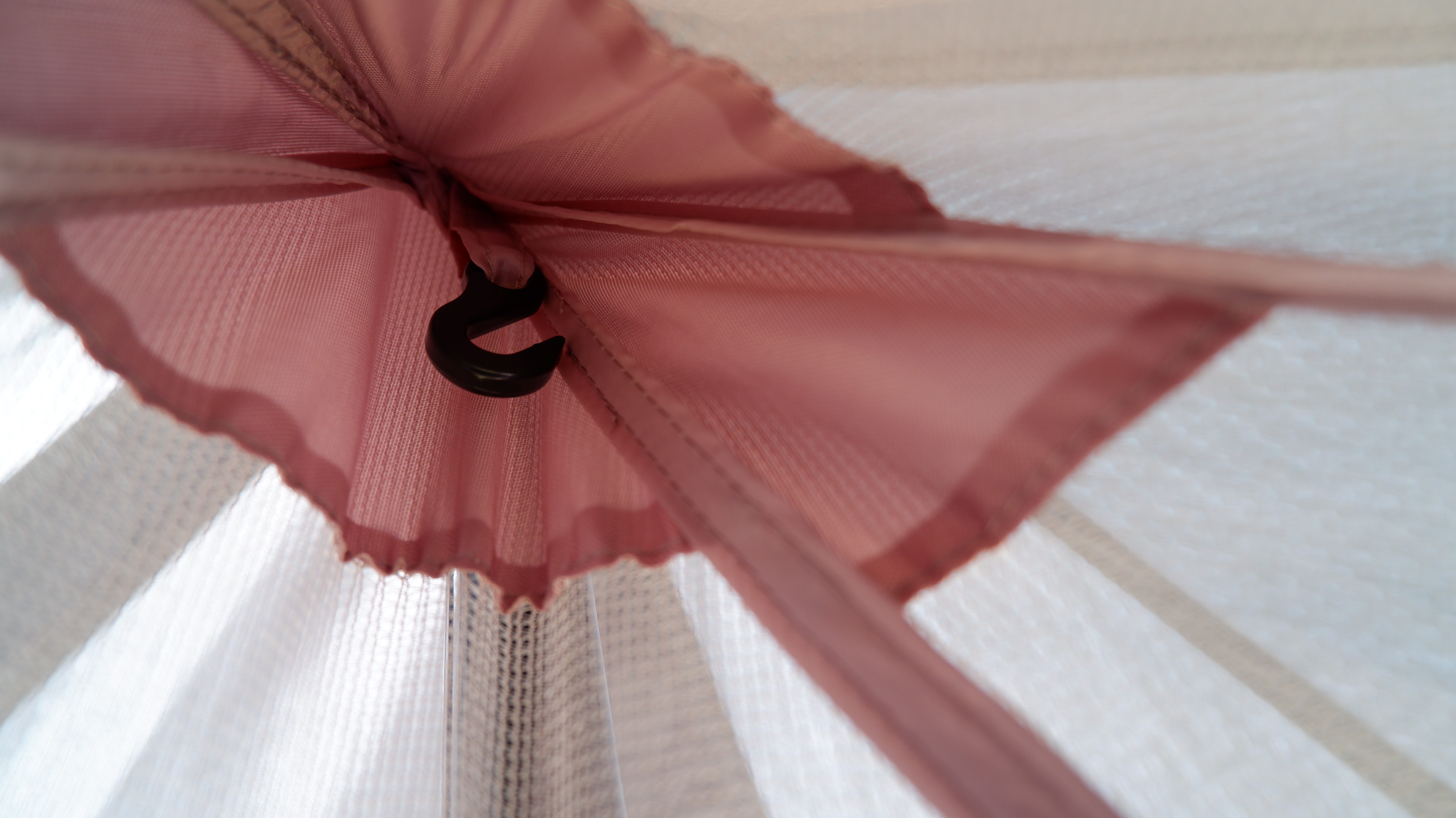 インナーテントの再度に赤いベルトについたフックがあり、フライシートの内側にも同様のベルトがついたリングがあるので、それに掛けてインナーテントの設営が完了。