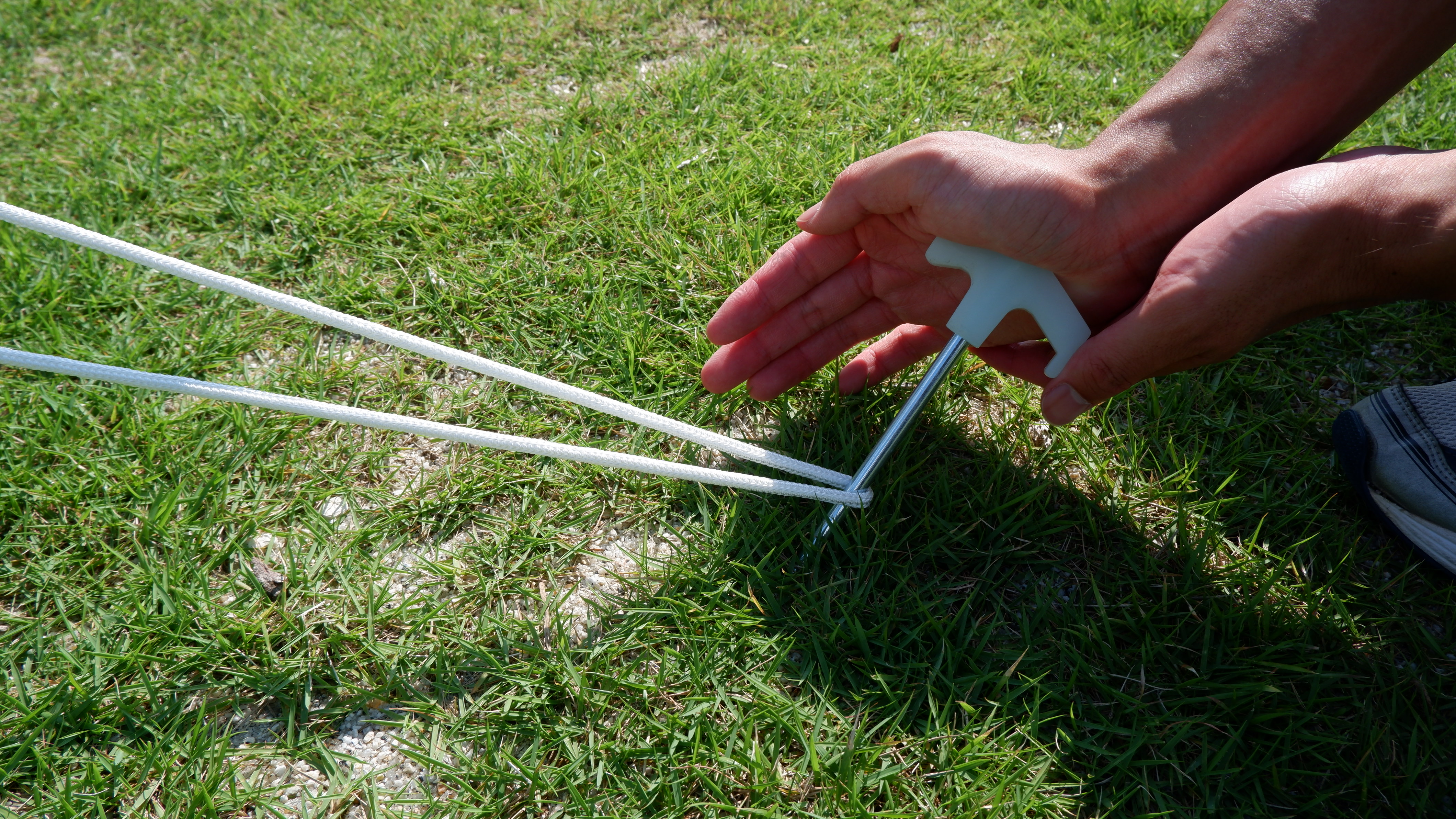 そしてロープのそれぞれをペグダウンする。そのときロープを少しポールに巻くように引っ張るとポールを立てた際にテンションが掛かり倒れにくくなる。