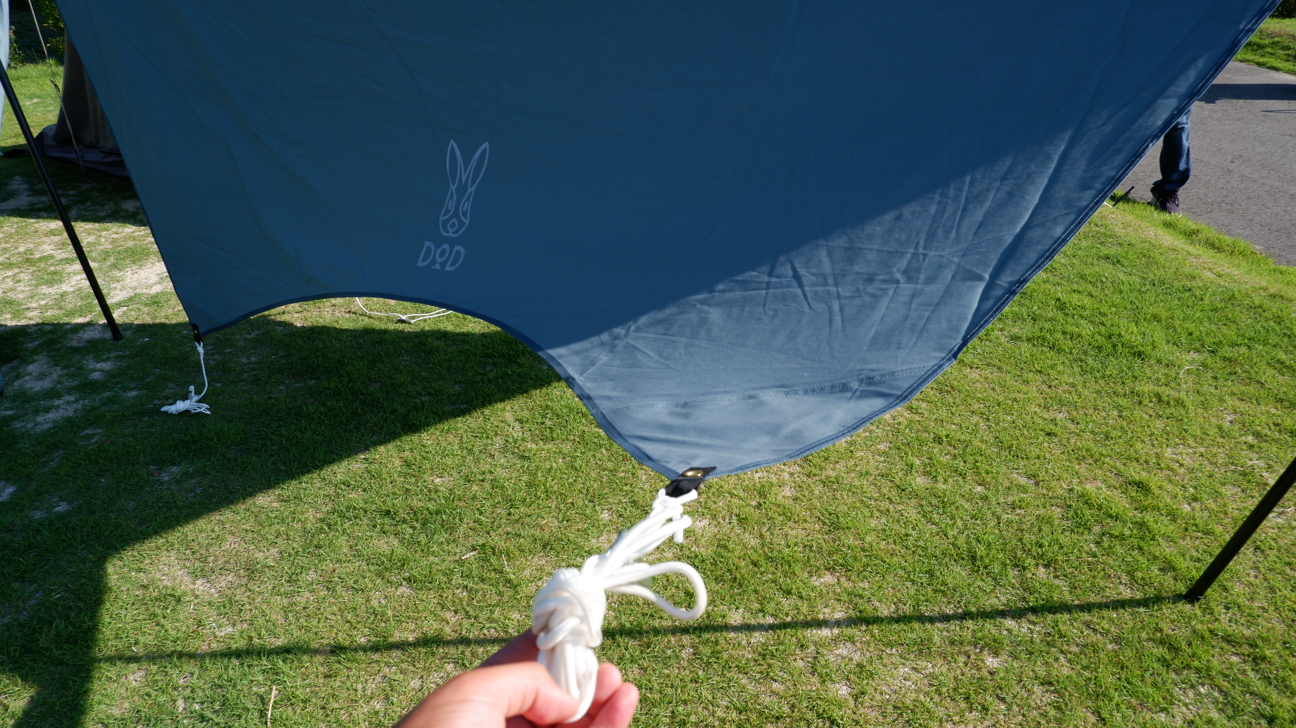 タープが立ったら次はロープが4箇所、購入したときから取付済みなので、それらを伸ばしペグを打ち込む。