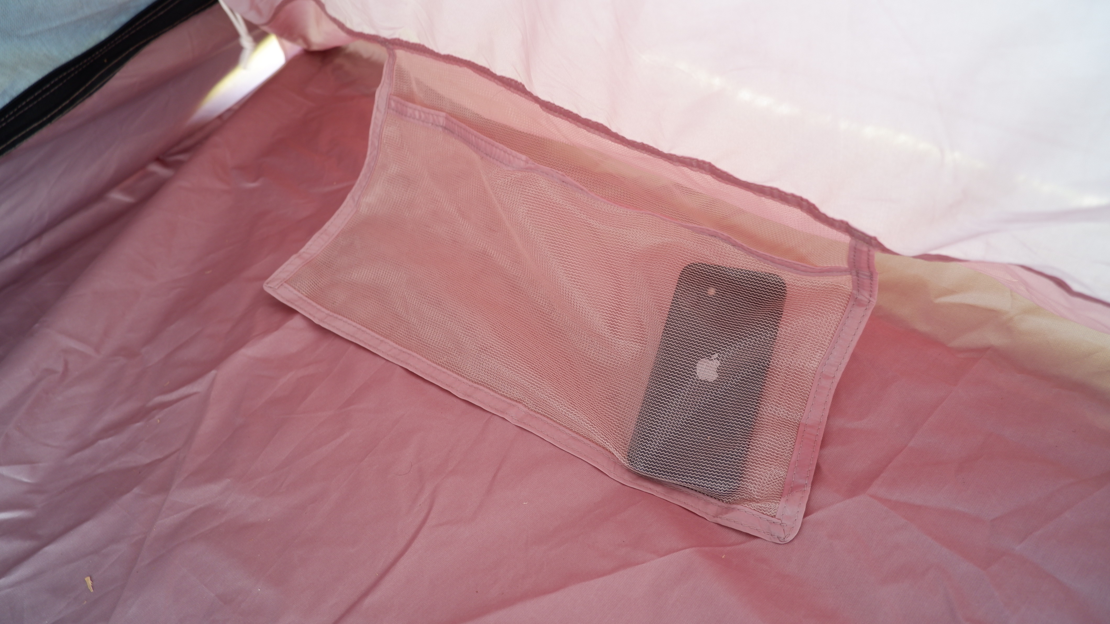 インナーテントの中にはスマートフォンや小物を収納できるメッシュポケット。上にはランタンなどを吊るせるフックがついている。