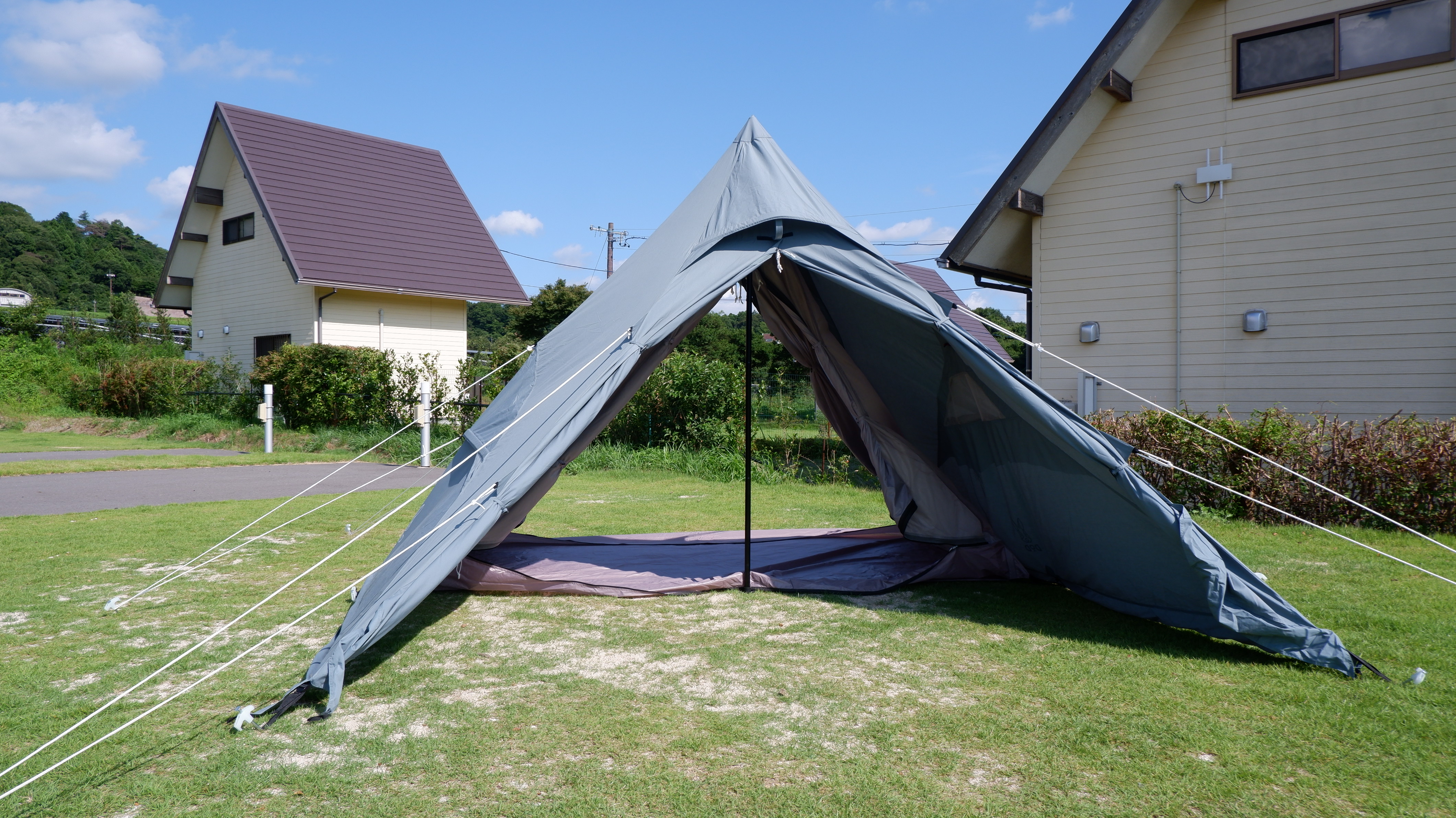 取り付けされているロープをそれぞれペグダウンするといよいよテントに完成。