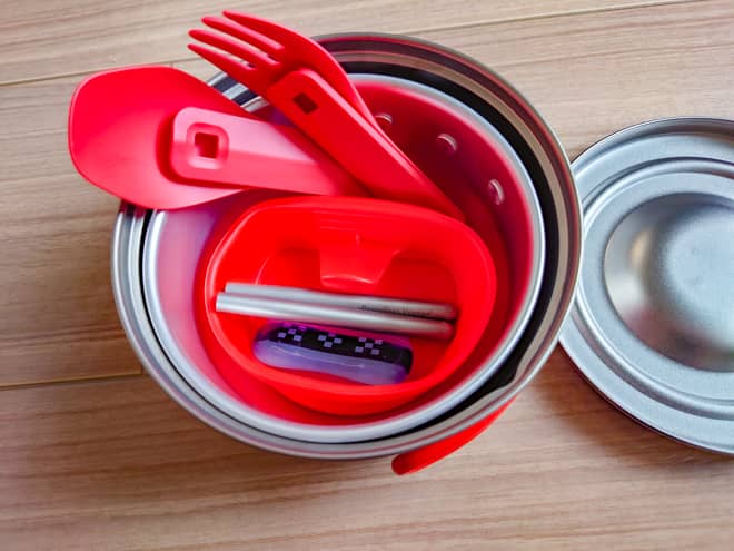 そして軽量コンパクトなカップなのでスタッキングも自由自在。筆者はエバニューのチタンクッカーにEPIのアルミクッカーを入れて、カトラリー類と一緒にスタッキングしています。この収まりが気持ち良い!