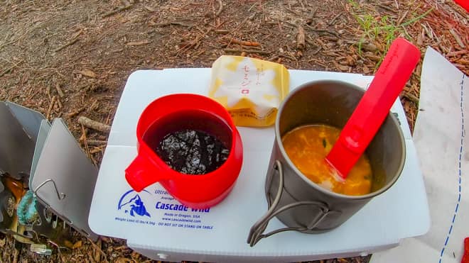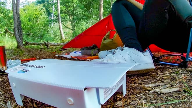 素材が頼りない感じもしますが、耐荷重は4kgとなっていてソロの食事を置くぐらいなら充分。意外にも耐熱温度が162度あり、テーブルの上でコーヒーを淹れても大丈夫。ただし焚き火の熱には耐えられないので、焚き火をする時は離れた場所で使う方が良いです。