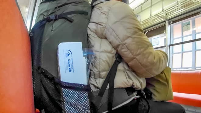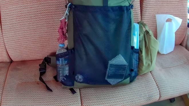 素材がプラダンなので60gと超軽量。二つ折りに畳んで収納できるので、ザックのサイドポケットにすっきり収まります。
