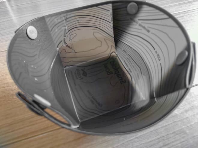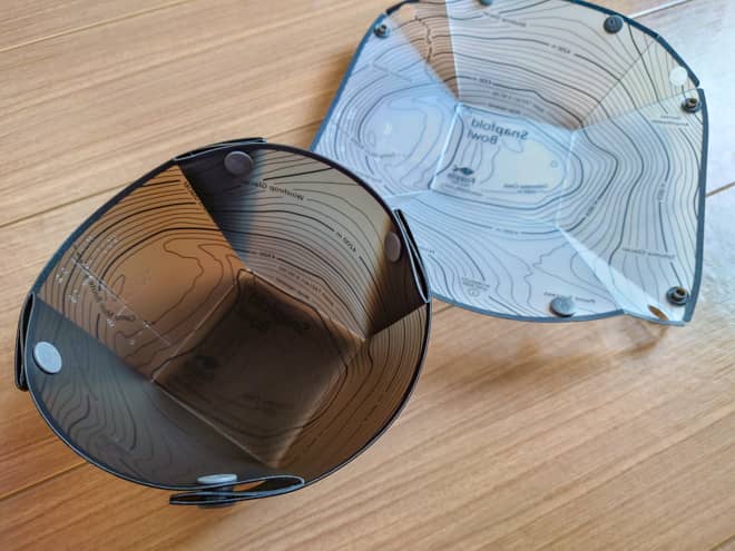 筆者は500mlのボウル2個セットを購入したのですが、グレーとホワイトの色違い。デザインは地形を表す等高線になっていて、アウトドアで使う食器って感じがなんだかカッコいい。