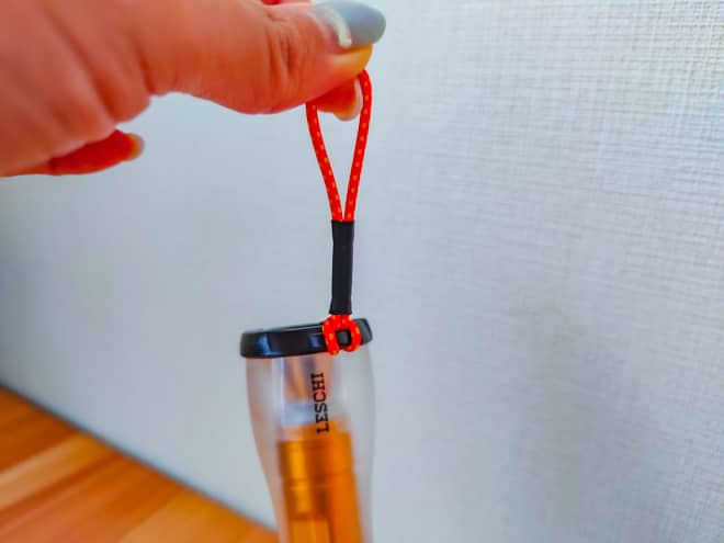 そして珍しいのがこのショックコード。先は輪っかになっているので普通に吊り下げもできますが、枝に引っかけたり、サコッシュに付けたりと様々な使い方ができます。
