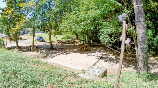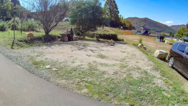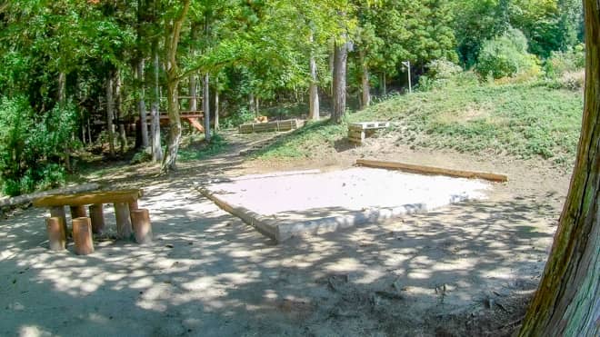 こちらもサイト内に木々があり雰囲気が良いです。すぐそばに遊具があり、車を駐車するスペースも十分な広さなので、お子さん連れのご家族にはぴったりのサイト。中央にはオーナーさん手作りのテーブルと椅子も設置されています。