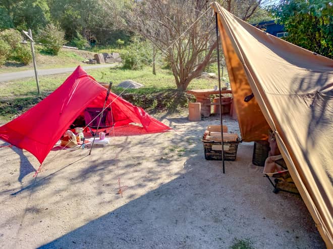 大きいテントを2つ設営してもスペースは余るほどです。こちらも通路沿いですが、サイトが奥まっているので設営の仕方によってプライベート感も保たれます。日差しを遮るものは何も無いので夏はタープが必須になると思います。