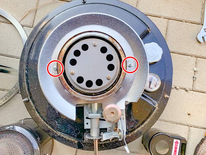 燃焼筒の周りにあるカバーのネジ2つを外します。このネジは耐震装置カバーのネジと共通です。