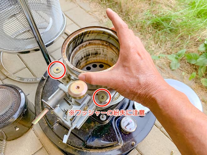 作業前に必ず灯油を抜き、芯を空焼きをして完全に灯油を空にします。