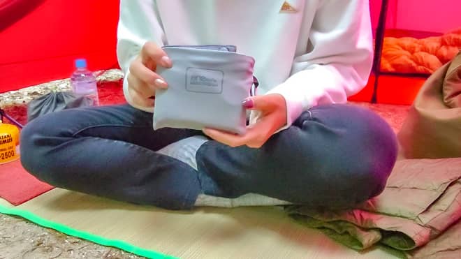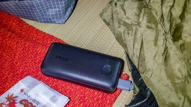 5000mAhの自宅にあったモバイルバッテリーを2つ持っていき、夕方~夜にかけて1つ使い、バッテリーが切れたらもう一つのバッテリーに取り替えて寝袋に入る。という感じです(製品によって持続時間は異なります)。