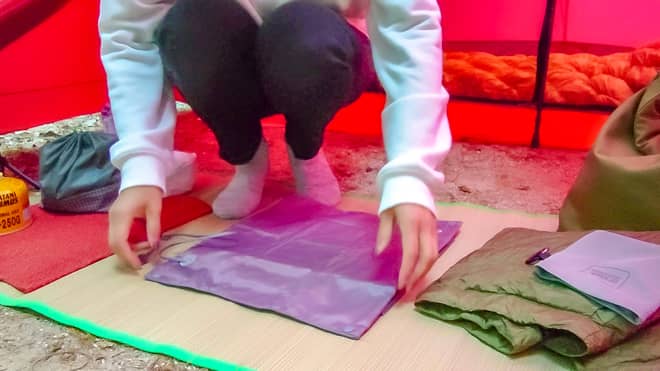 筆者の場合は丸めてバックパックに詰めて、夕方ごろに着込み、着込んだまま寝袋に入ります。