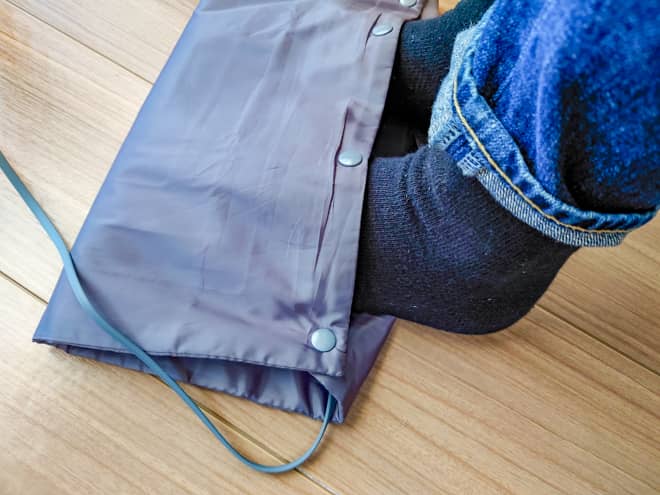 エネタンポはスナップボタンが付いているので、ボタンを留めて足先を入れるとかなり暖かい!コンパクトに折り畳めて収納袋付きなので会社へ持って行くこともできます。