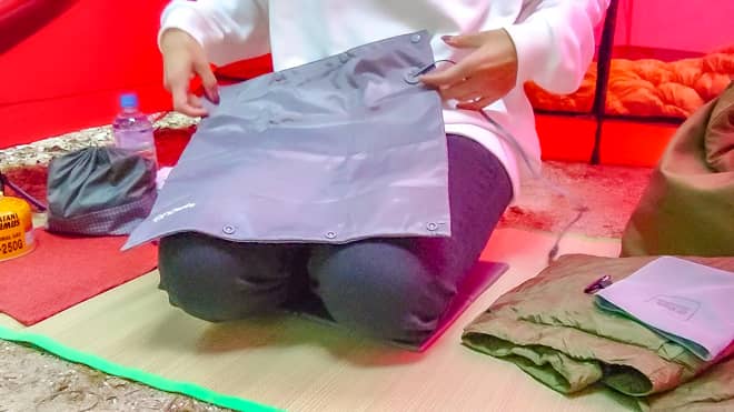 ペラペラのナイロン生地でクッション性はありませんが、山座布団に敷こうと思っていた筆者にはぴったり。そのまま使っても暖かいですが、ひざ掛けをプラスするとかなり暖かいです。