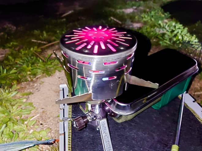 徒歩キャンプでも持って行けるヒーターの代表格と言えばヒーターアタッチメント。使い方は超簡単でバーナーの上に置くだけ。筆者の場合は一酸化炭素中毒が怖いので、テント内ではなく開放した前室で手元を温める為に使用しています。