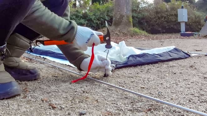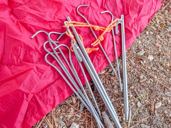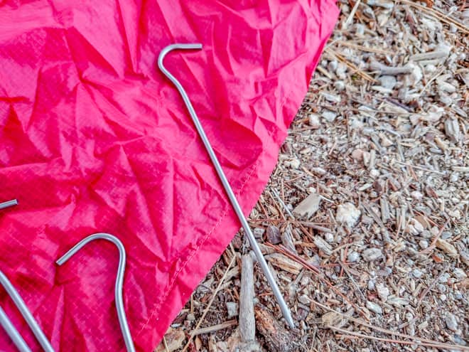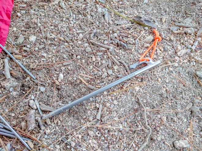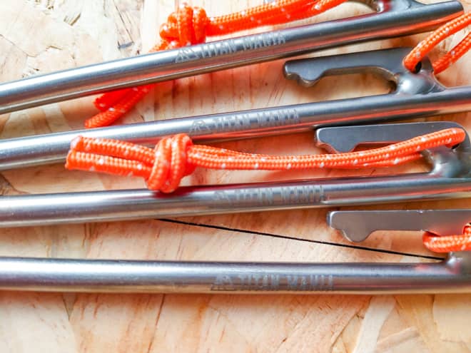 見た目はテントを買った時に付いてくる貧弱なアルミペグの様ですが、チタンなので強度はしっかりしています。石や木の根っこにあたり1本だけ少し曲がってしまいましたが、自立式テントやUL系のソロテントであれば十分な強度です。