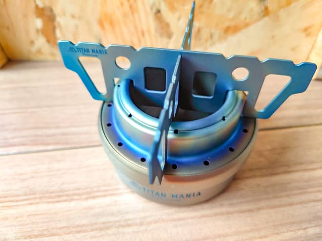 そしてチタンなので錆びないしお手入れも簡単。焼きが入るとチタンブルーで渋さも増すので、チタン好きには堪らないはず。サイズぴったりなアルコールストーブやクッカーも販売されているので、シリーズ買いしても面白いですね。