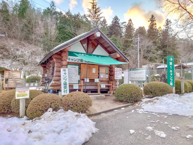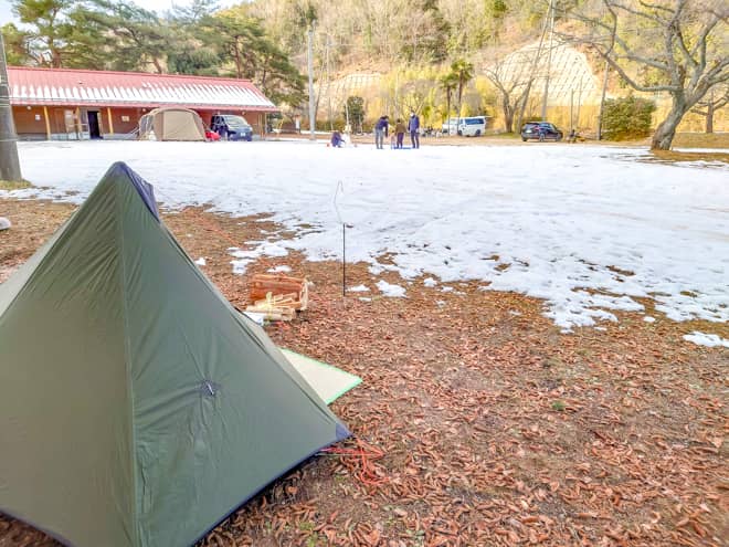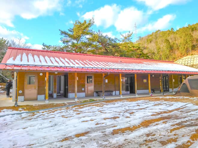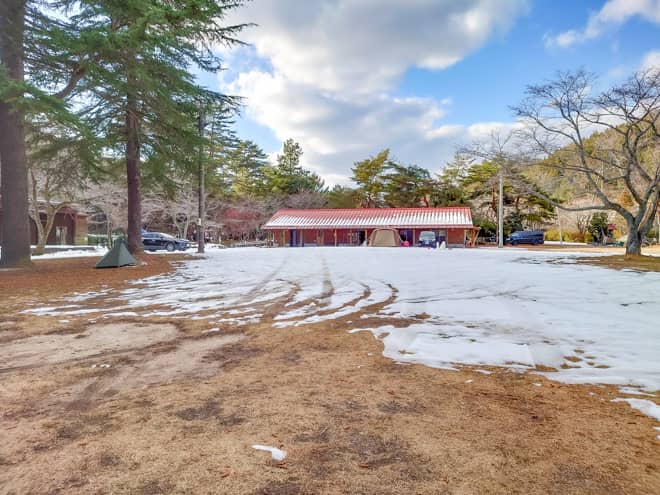 広島市街地から1時間程度とアクセス良好な岩倉ファームパークキャンプ場。筆者が宿泊した日は前週に何年かぶりの大雪が降った為、かなり雪が残っておりました。普段はそこまで積もらないと思いますのでご了承ください。