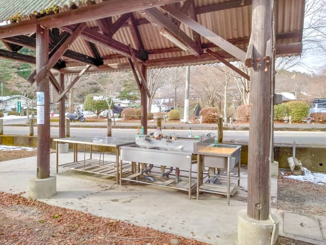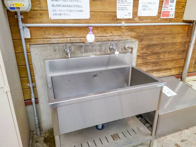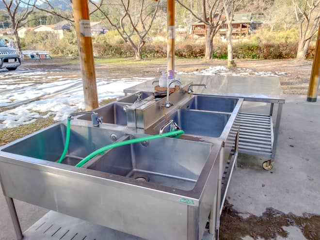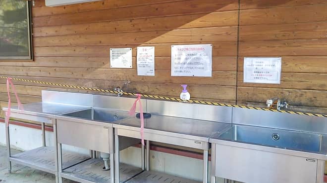 一般的な炊事棟。温水は出ません。綺麗に清掃されており、ハンドソープが置いてあるのが嬉しいです。