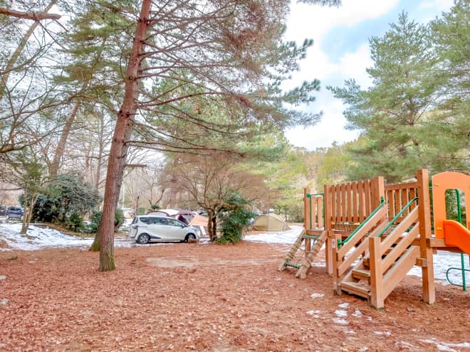 林なので車の横付けができませんがプライベート感があり、ハンモックもできるのでソロにはおすすめです。また、遊具が置いてあるスペースもあるので遊具付近はファミリーキャンパーさん向けになります。