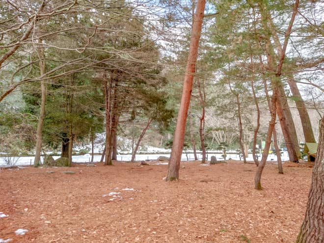 筆者が宿泊した日は雪が残っていたので芝生では無かったですが、見渡しの良い広場で大きな松の木があります。夏は日陰になってちょうど良さそう。ここはトイレや流し場があるライトハウスが目の前なので便利なサイトです。