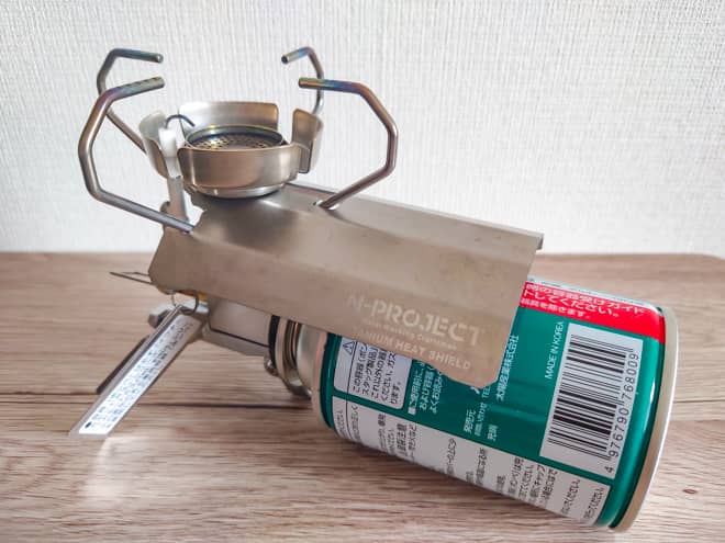 見た目だけでは無く、機能面もさすが日本製と言う感じ。厚みのあるチタンなのでそれだけでも遮熱効果は十分ですが、取り付けも五徳下のバーナーシャフトに取り付ける仕様で、ガス缶に干渉しない様になっています。