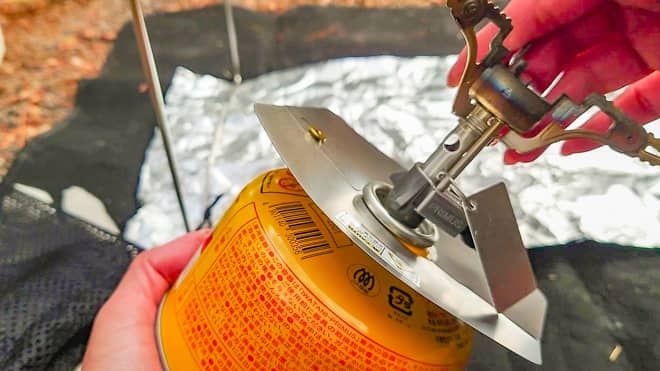 実はリニューアルされており、以前はバーナーシャフトに取り付ける方式だったそうですが、現在はバーナーの枠に引っ掛けるだけなので取り付けが超かんたん!取り付けにイライラする事もありません。バーナーシャフト部分に取り付けるより、バーナーの枠に引っ掛ける方がガス缶と遮熱板の隙間もより開くので、遮熱効果も向上しています。