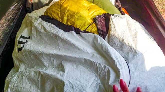 タイベック素材のシュラフカバーです。結露でシュラフが濡れないように使用しています。実は内側がシルバー蒸着されているものと間違えて購入してしまったのですが、こちらでもシュラフの保温性は十分アップ。シルバー蒸着されたものより軽量なので、間違えてこちらを購入して良かったと思っています。