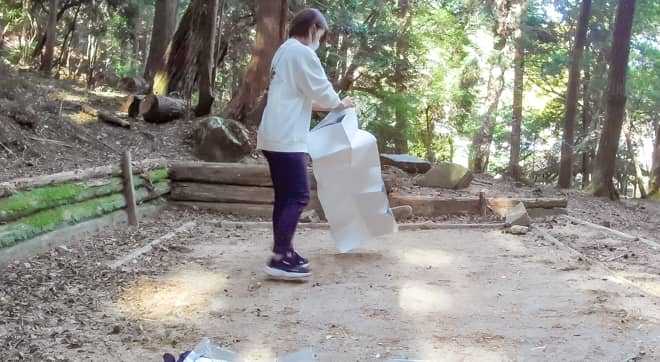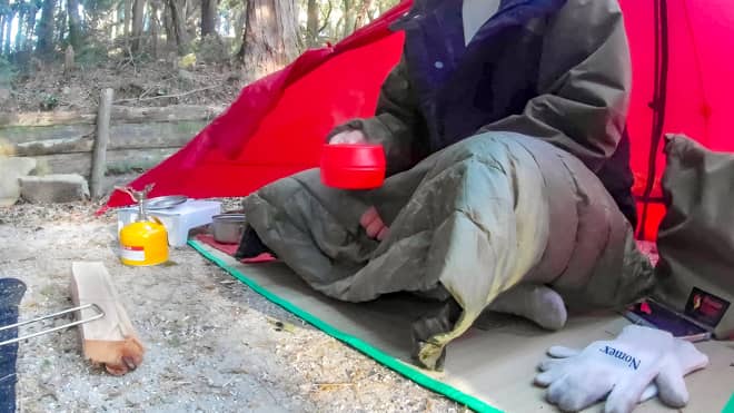 筆者は陽が落ちて気温が下がってきたらアウターの下にダウンジャケット、パンツの上にダウンパンツを着込み、ひざ掛けにダウンスカート、地べたスタイルの時はダウンソックスもプラスします。シュラフに入る時はインナーシーツをセットで使うので汚れを気にする事なく、防寒着で着用していたダウン上下のまま寝ています。