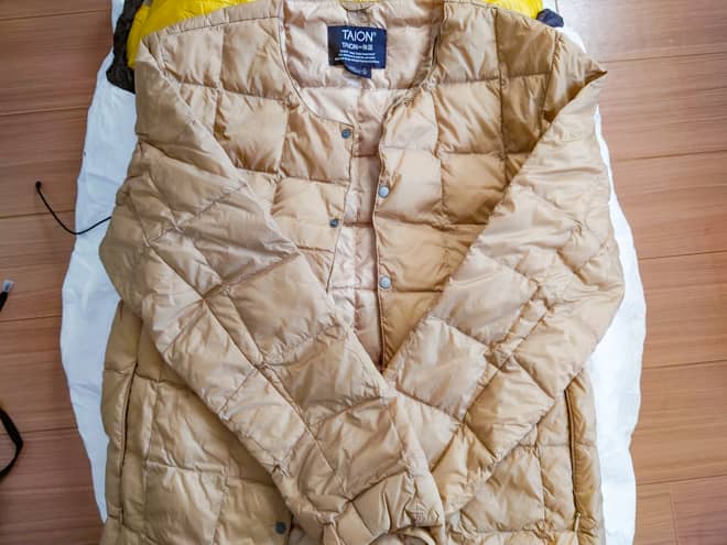 アウターの下に着るインナーダウンジャケットです。アウトドア用のダウンジャケットになると黒ばかりになるので、あえてTAIONのベージュにしました。
