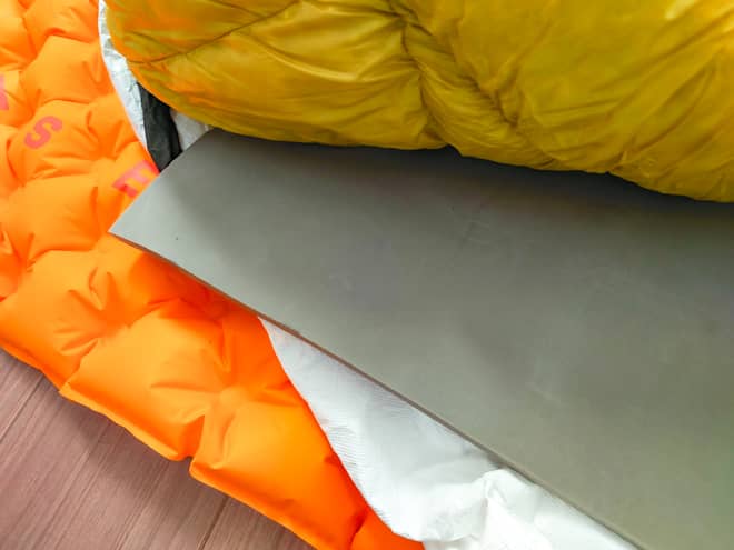 マットを二枚重ねると寝ている間にズレて結局背中が冷たい…と言う事もあるので、こちらのマットを使用する時はシュラフカバーの中に入れて背中からズレない様にしています。