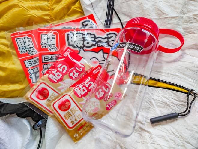 湯たんぽは湯たんぽ専用の物では無く、ナルゲンボトルを湯たんぽとして使用しています。ナルゲンボトルであればキャンプに行く時は食料入れや飲料入れとしても使用できるので一石二鳥です。カイロはどうしても寒い時の為にお守りとして持参します。