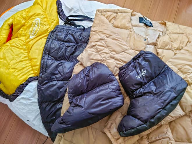 特にダウンジャケットやダウンパンツは、就寝時以外は防寒着として使用できるのでかなりおススメ。シュラフで足りない保温性は他のアイテムを重ねる事で快適に過ごせますよ!