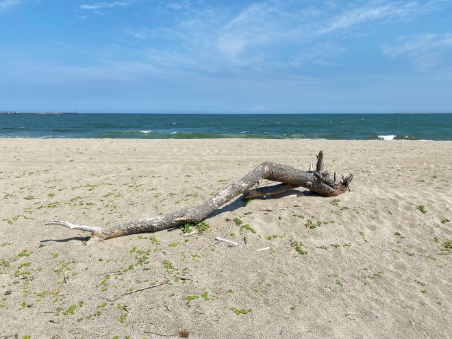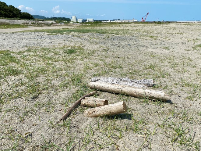 砂地には誰かが持ってきたのか、それとも打ち上げられていたのをノコギリでカットしたのか、薪になりそうな流木が落ちていました。焚き火をする際は必ず薪を持参し、燃え残った薪や灰は持ち帰ることが原則ですが、運がよければこうした流木が拾えるかも知れません。ただし期待するのは禁物です。