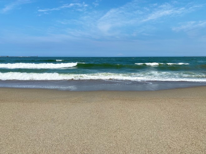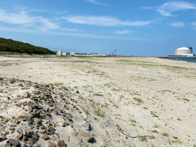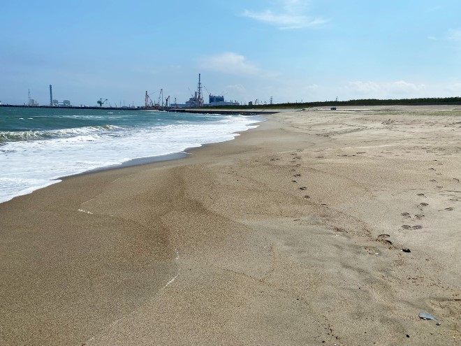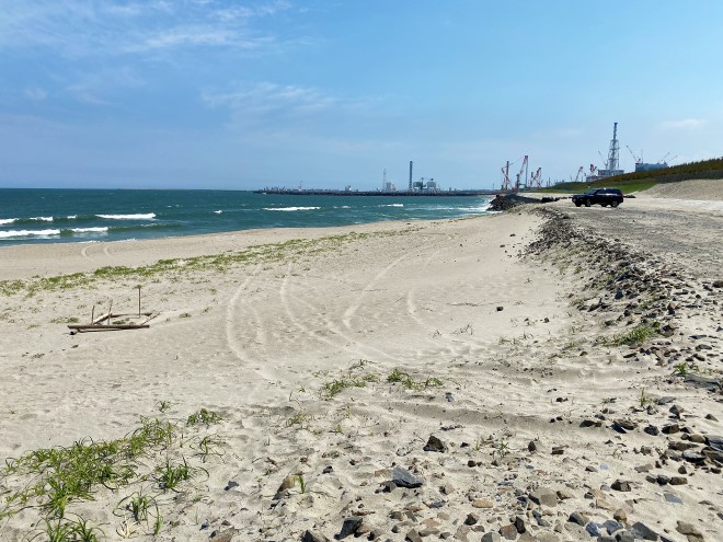 豊岡海岸(久慈川河口緑波)は、久慈川が太平洋に流れ込む場所に位置しており、真っ白な砂浜とエメラルドグリーンの海が美しい海岸です。すぐ南には東海村の原子力発電所があり、北側には日立の工場が広がる工業地域で、砂浜の両サイドを工場に挟まれた海岸でもあります。