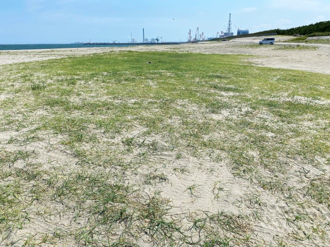 豊岡海岸の砂浜はかなり緩くサラサラの砂地です。海水浴であれば最高のフィールドですが、テントやタープの設営にはかなり苦労することになりそうです。また海風も強く、安定した設置をしないとタープが倒壊する恐れもありますので注意してください。