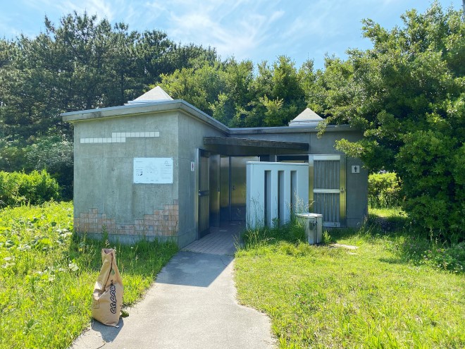 トイレは豊岡海岸の手前で防風や防砂の役割を果たしている久慈川河口緑波の中に設置されていて、こちらは定期的に清掃もされています。水洗式でトイレットペーパーも備え付けられていますが、利用する際は予備のトイレットペーパーを準備しておいた方が安心です。