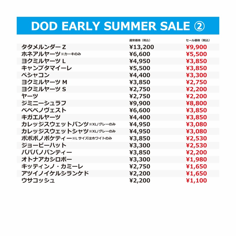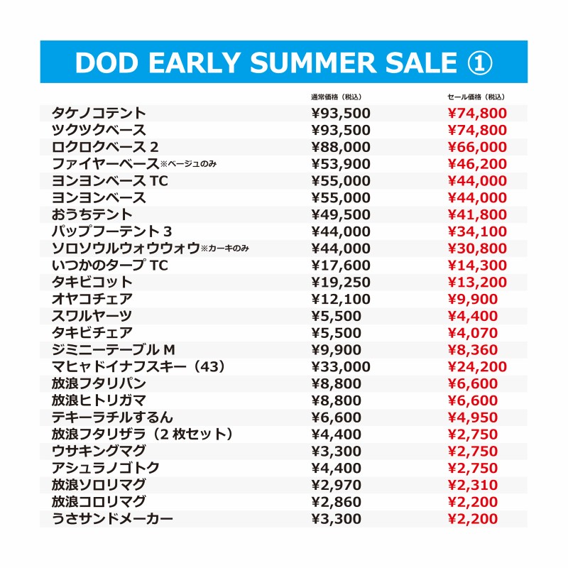 その名も「DOD EARLY SUMMER SALE」。期間は5月30日(火)から6月13日(火)10:00まで。